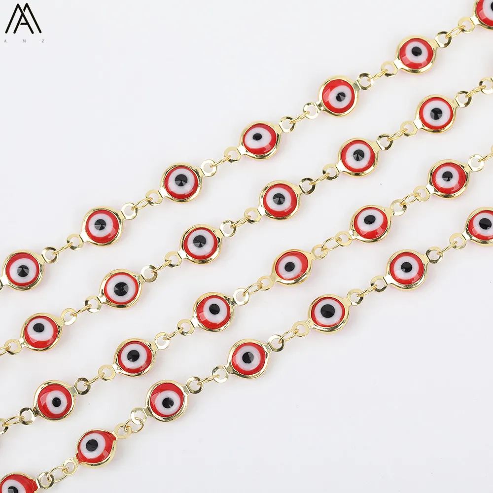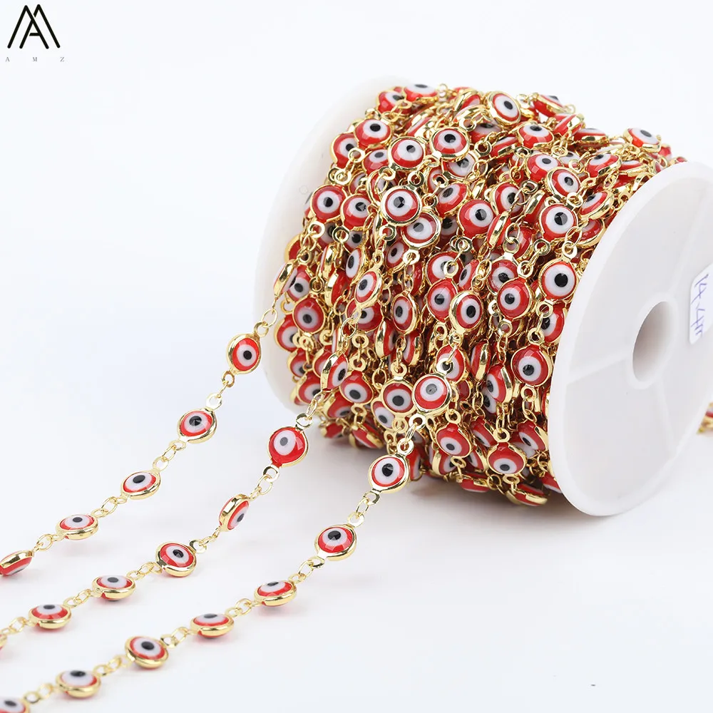 HIGH QUALITY 5meter 7mm Red Color Evil Eyes Coin Beads Rosary ChainsFlat Round Enamel Beads Gold Chains Jewelry