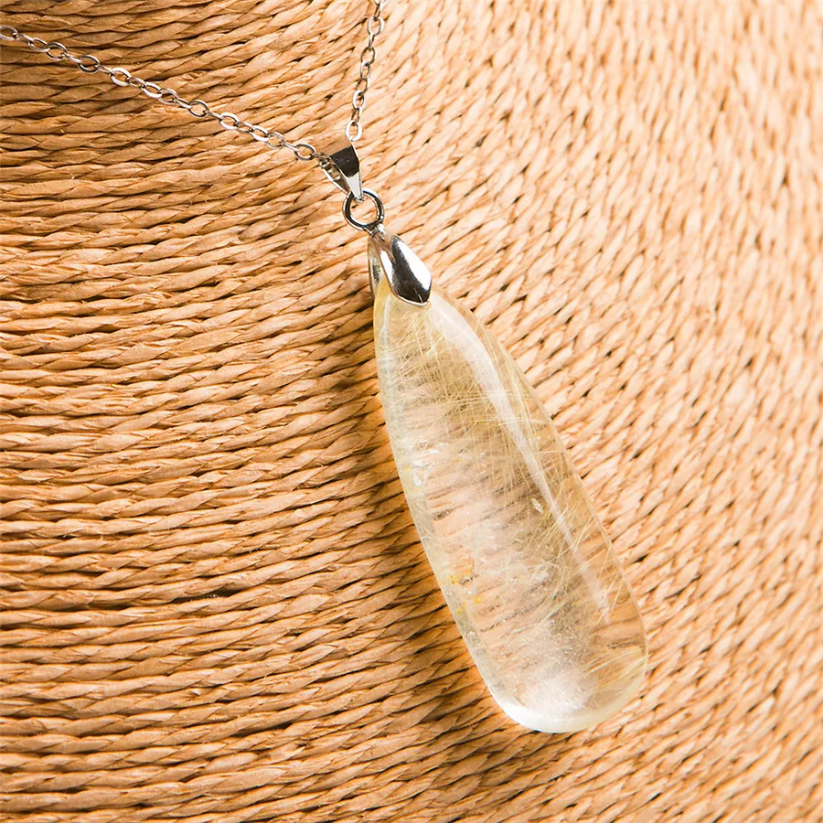 Review Top Genuine Natural Titanium Rutilated Quartz Crystal Waterdrop Bead Fashion Women Necklace Pendant 44*