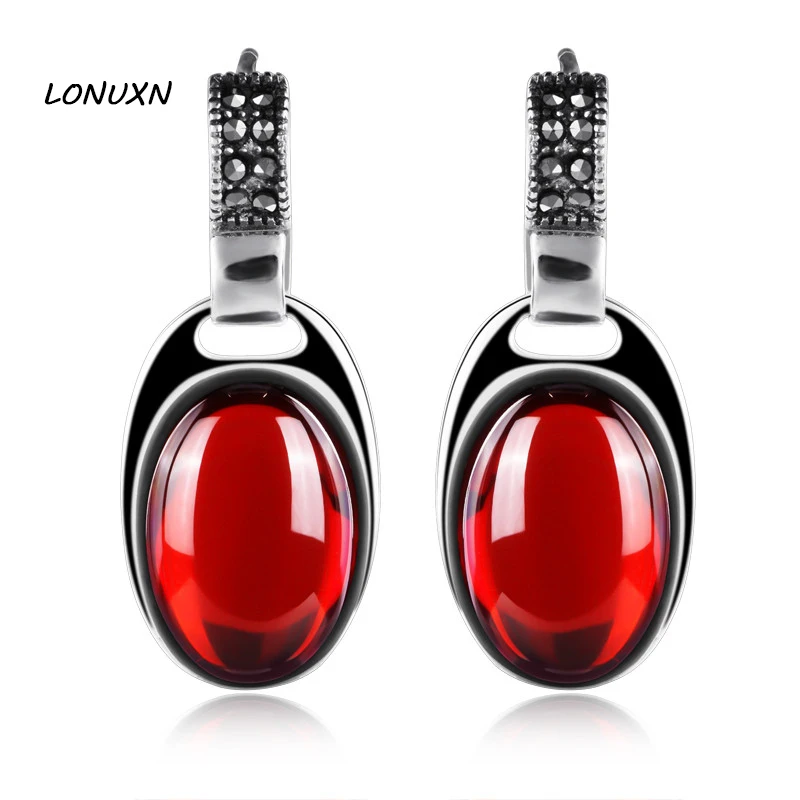REVIEW TOP SELLER 13.5cm high quality 925 Sterling silver natural Semi-precious stones red Garnet Retro Earrings fema